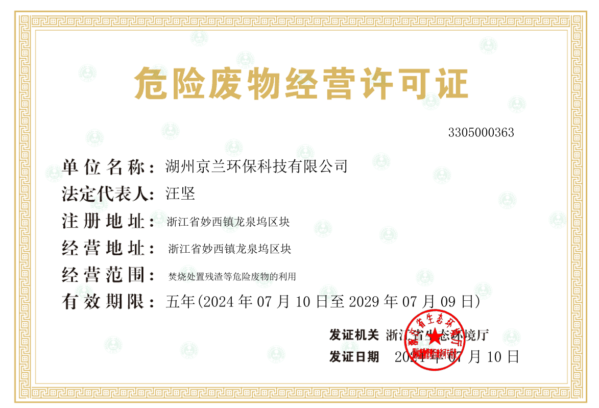 近日,湖州京蘭環(huán)保科技有限公司(下稱湖州京蘭)順利完成危險廢物經營許可證換證工作,取得由浙江省生態(tài)環(huán)境廳頒發(fā)的危險廢物經營許可證,有效期為5年。